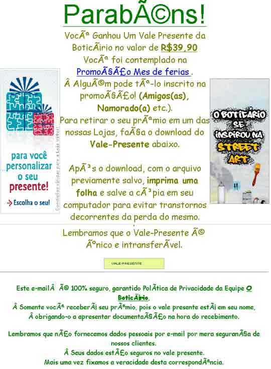 | | Este e-mail é 100% seguro, garantido Política de Privacidade da Equipe O Boticário, Somente você receberá seu prêmio, pois o vale presente está em seu nome, obrigando-o a apresentar documentação na hora do recebimento. Lembramos que não fornecemos dados pessoais por e-mail por mera segurança de nossos clientes. Seus dados estão seguros no vale presente. Mais uma vez fixamos a veracidade desta correspondência.